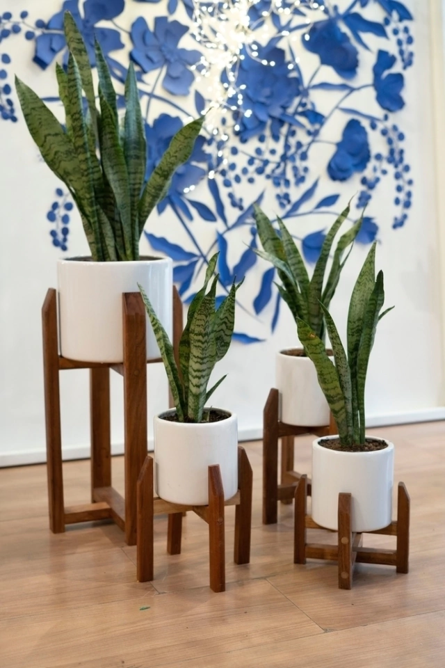 Kit de macetas de cerámica blancas con base de madera + lanta Espada